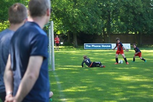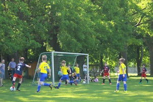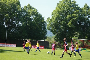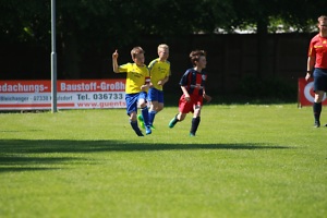 Nach diesem Treffer ließen die Kids um Kapitän Marius Hänsel es in der Sommersonne etwas ruhiger angehen. Dadurch kamen die Gäste auch besser ins Spiel und versuchten über die schnellen Außen nach vorn zu kommen. Bis dahin machten es die Saalfelder Abwehr aber clever und klärten die Bälle souverän. Kurz vor der Halbzeitpause fielen nochmal zwei weitere Tore. In der 23. Minute konnte sich Clemens Fischer belohnen für seine gute engagierte Leistung. Nachdem die Gäste in der Abwehr ein Querpass Spielten, reagierte Clemens schnell und versenkte im 1 gegen 1 den Ball im Kasten.